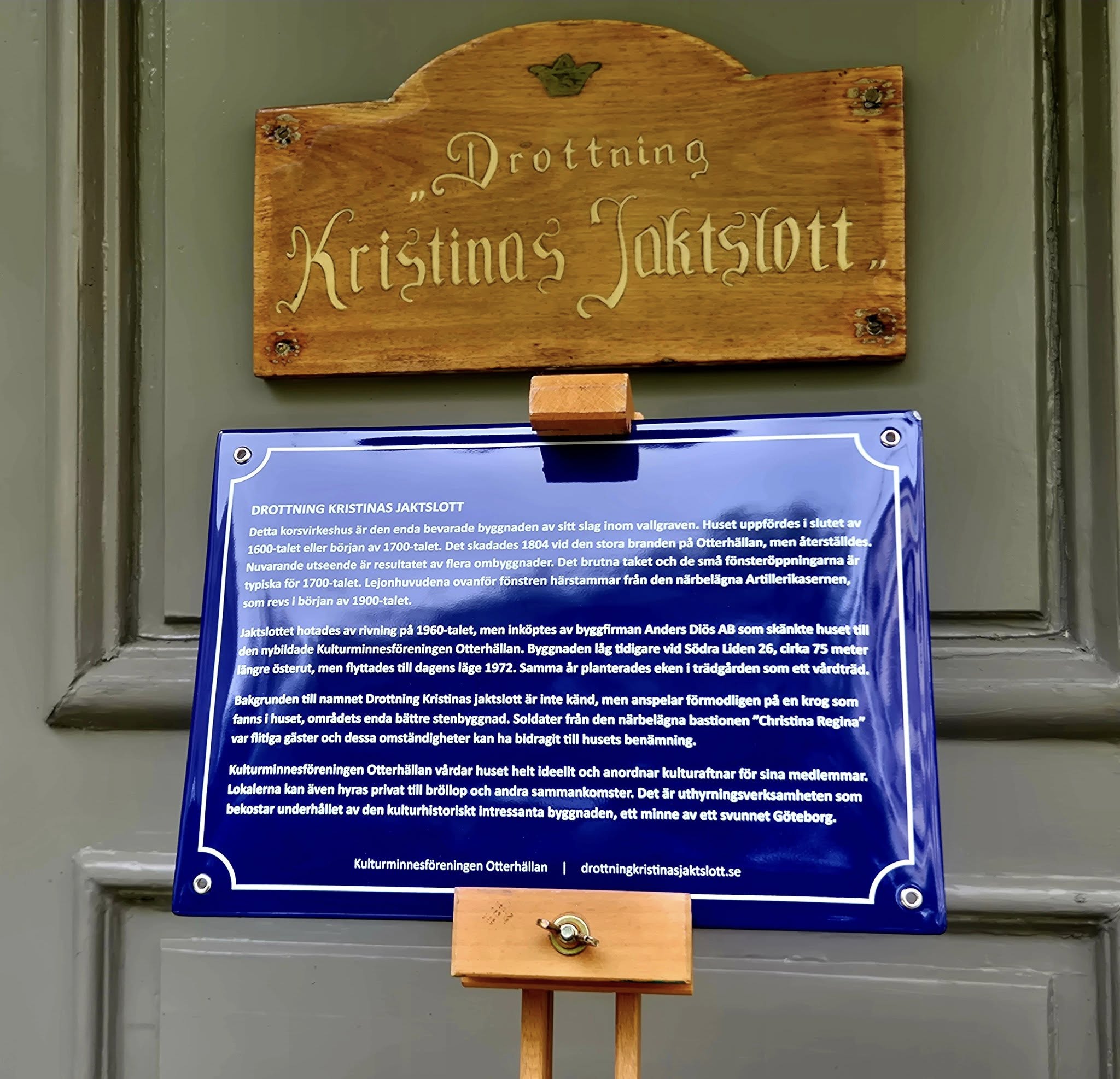 Plaketten kommer senare, att placeras på en egen ställning eller stolpe vid ingången till Jaktslottet. Texten på plaketten skrevs av Pether Ribbefors. Initiativ till plaketten tog Erika Kern, tillförordnad VD för Innerstaden Göteborg, och Eva Flyborg, ordförande i Kultuminnesföreningen Otterhällan.