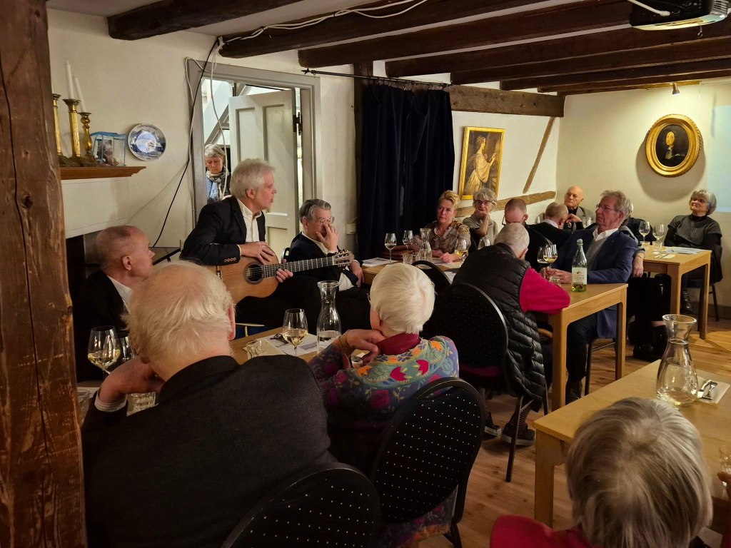 Martin Bagge sjön visor och dikter av Evert Taube och Brittmo Bernhardsson berättade om och visade bilder på konstverk av Astri Bergman Taube vid Årsmötet den 12 mars 2025, som dessutom var Everts födelsedag. Foto: Eva Flyborg.